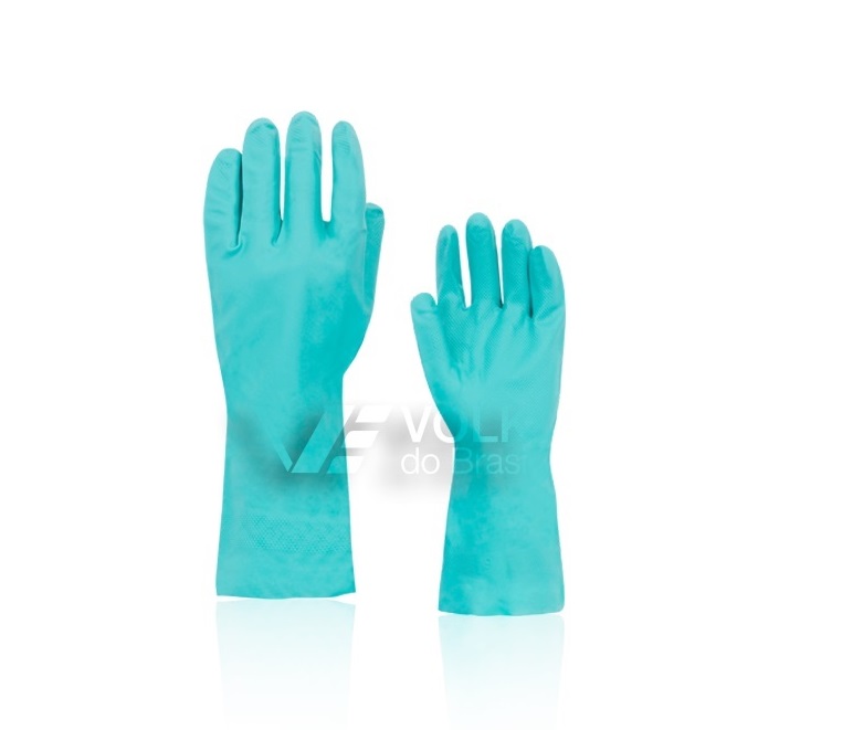 Luva de proteção em borracha nitrílica: Luva de proteção utilizada para a proteção das mãos e dos punhos contra potenciais acidentes com agentes biológicos e químicos.